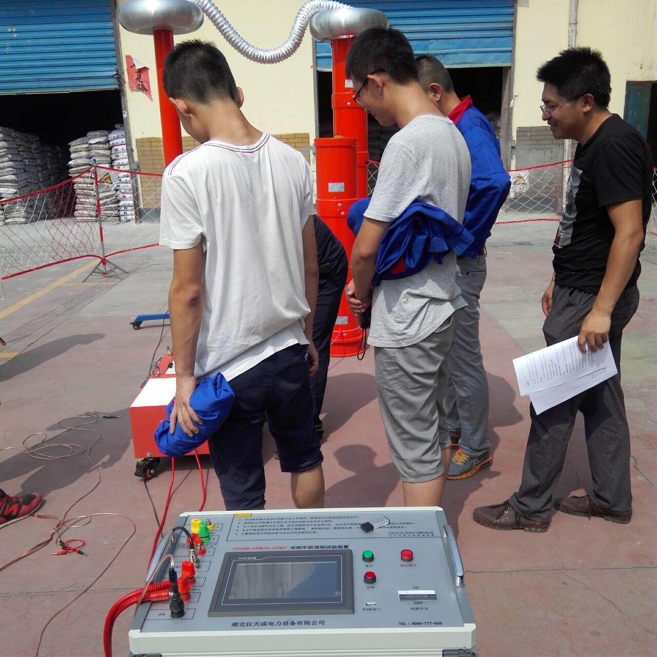 李工很快抵達現(xiàn)場,與客戶進行面對面的交流,了解客戶的需求和想法。然后開始講解設備,并認真講解怎樣安全操作設備。確??蛻裘靼琢税踩僮饕院螅罟ьI客戶一起做試驗——YTC850-270kVA/270kV變頻串聯(lián)諧振試驗裝置,YTCDG-1000A大電流發(fā)生器 這2套設備,其中這套變頻串聯(lián)諧振試驗裝置我公司的該設備為專利產(chǎn)品,諧振電源調(diào)頻及功率元件使用先進的日本進口的優(yōu)質(zhì)元器件,設計的是諧振式濾波電路,能改善輸出電壓的波形畸變,獲得很好的正弦波形,有效的防止了諧波峰值對試品的誤擊穿。變頻電源保護功能強,穩(wěn)定性好;具備具備全自動(自動調(diào)諧、自動升壓)、全手動(手動調(diào)諧、手動升壓)以及半自動(自動調(diào)諧、手動升壓及手動調(diào)諧、自動升壓)的多種工作模式,可任意切換使用;操作方便。