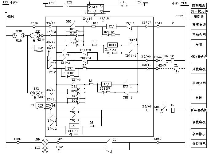+KM → X5/16 → TBJ-1(TBJ-2)→ X5/08 → TQ線圈 → -KM,從而啟動(dòng)斷路器跳閘線圈TQ,實(shí)現(xiàn)了手動(dòng)跳閘。