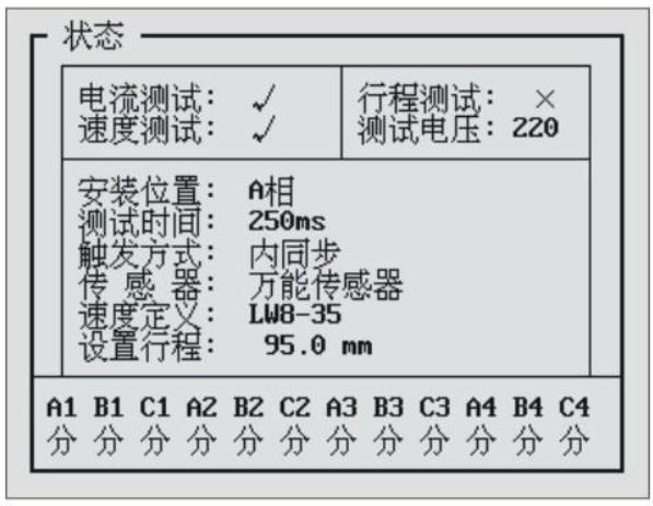 答:選擇【測試】-【合閘測試】,儀器液晶顯示屏的最下方有12斷口的實時狀態(tài)顯示。屏幕顯示如下圖: