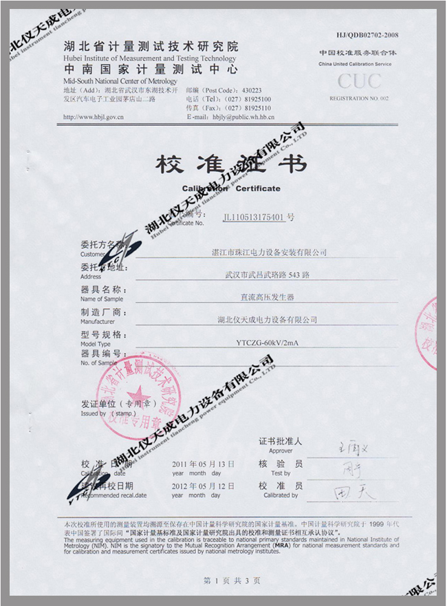 YTCZG-60kV/2mA直流高壓發(fā)生器鑒定證書(shū)
