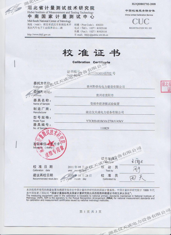 YTC850-810kVA/270kV/45kV變頻串聯(lián)諧振試驗(yàn)裝置的資質(zhì)證書